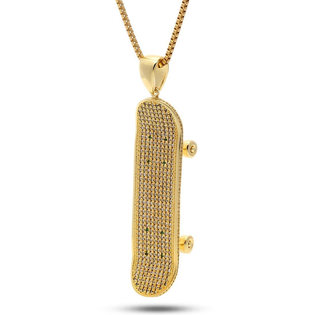 Featuring CZ stones that stretch from the deck to the truck bolts comes this 14K Iced Skateboard. With clear CZ stones lining the deck and green stones covering the top trunk bolts, each piece comes plated with 14K Gold to provide added shine and protection. And each includes 24", 2mm box chain, this skateboard provides the rough and rugged durability that appeals to your lifestyle.