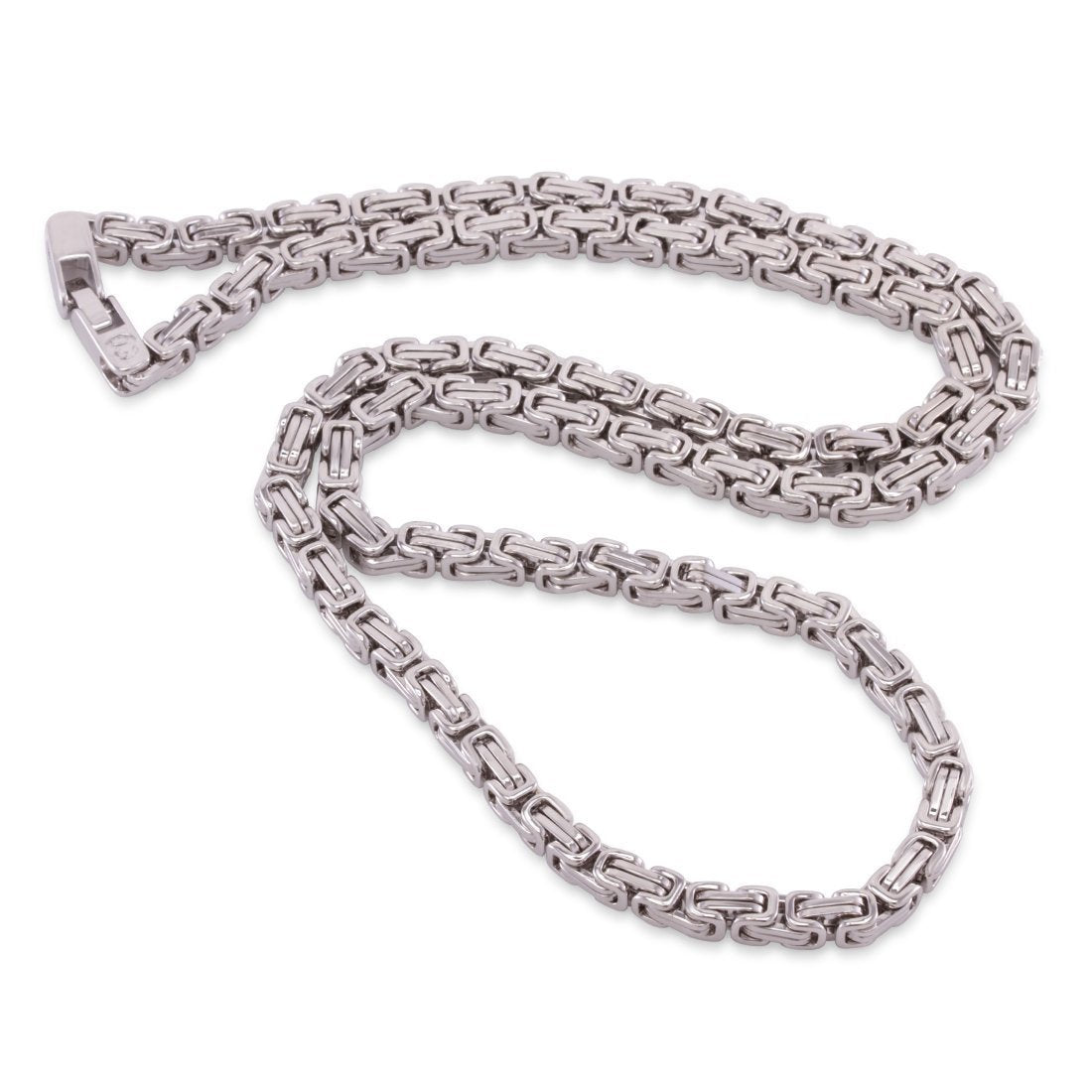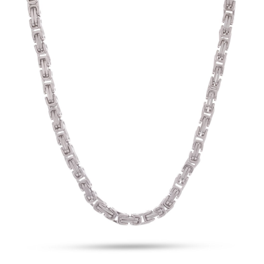 Check out this 5mm men's bike chain designed by King Ice. It features a white gold-ionic plating with a high-polish finish and a fold-over clasp. This 5mm chain is available in different lengths. The King Ice logo is engraved on the clasp.