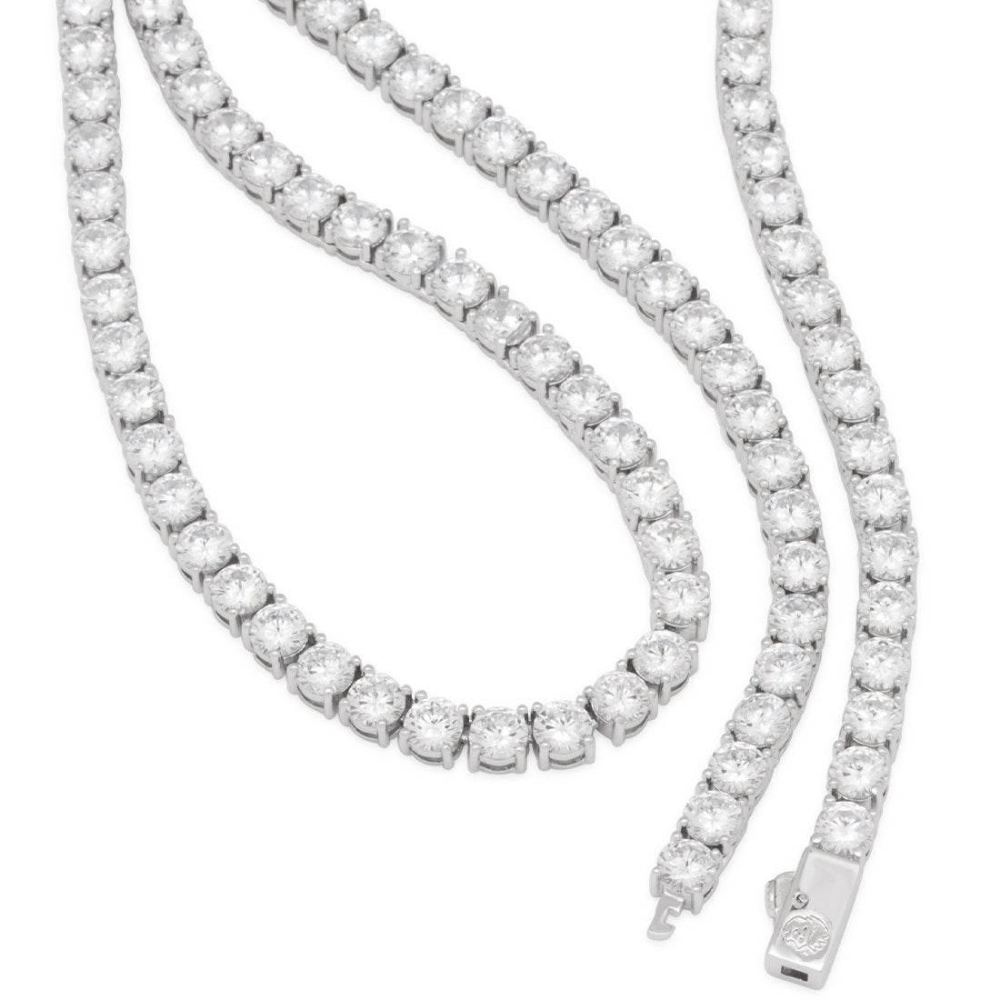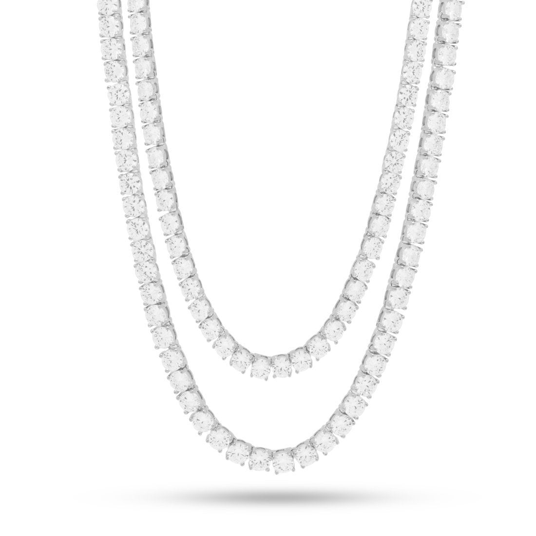 The new King Ice 5mm White Gold Tennis Choker Set pays tribute to the multi use trend rooted by prominent hip hop artists since the late 70s. Each choker is plated with a white gold finish and white gold prongs frame VVS Diamond Simulates. The chokers measure 18" and 20" for a suitable match when worn together.