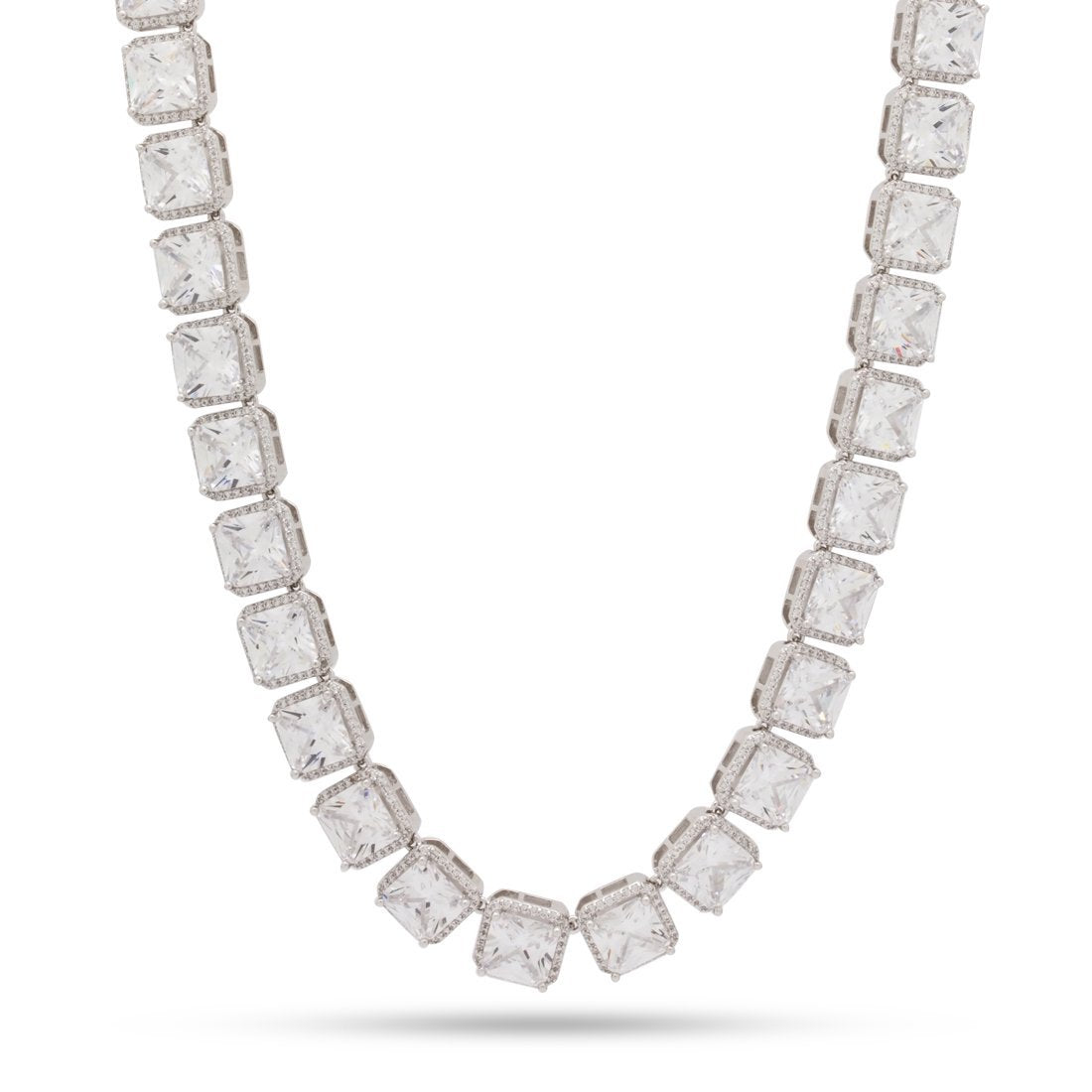 The Princess Cut Tennis Chain has a large princess cut CZ stone supported by four prongs. Glistening round stones neatly border the princess stone for extra ice. The chain features a hallow bridge under the emerald stone, giving each link a detailed look. Each chain has a tongue box clasp for a secure wear. The chain is available in 14K Gold and white gold plating for different looks.