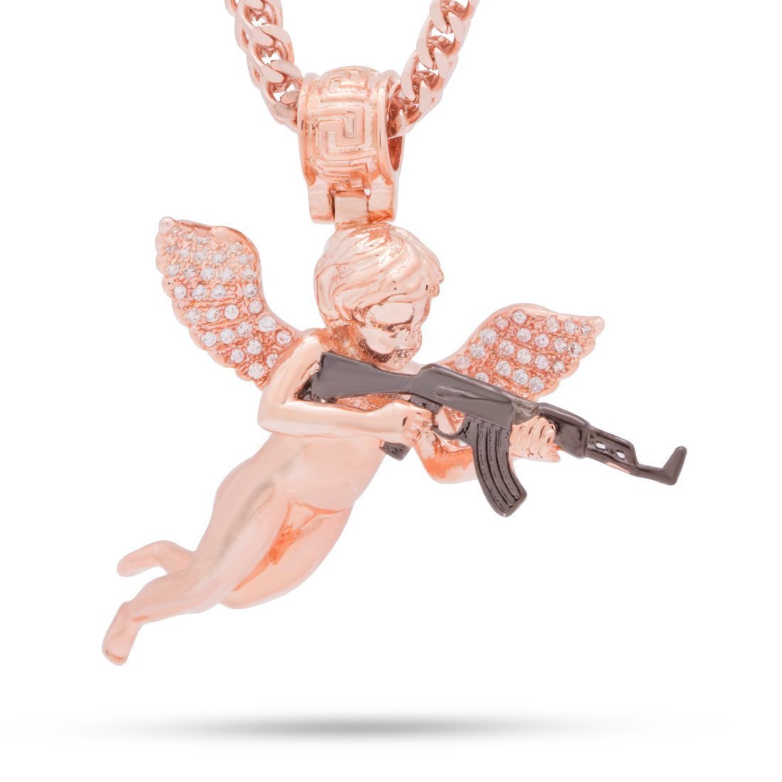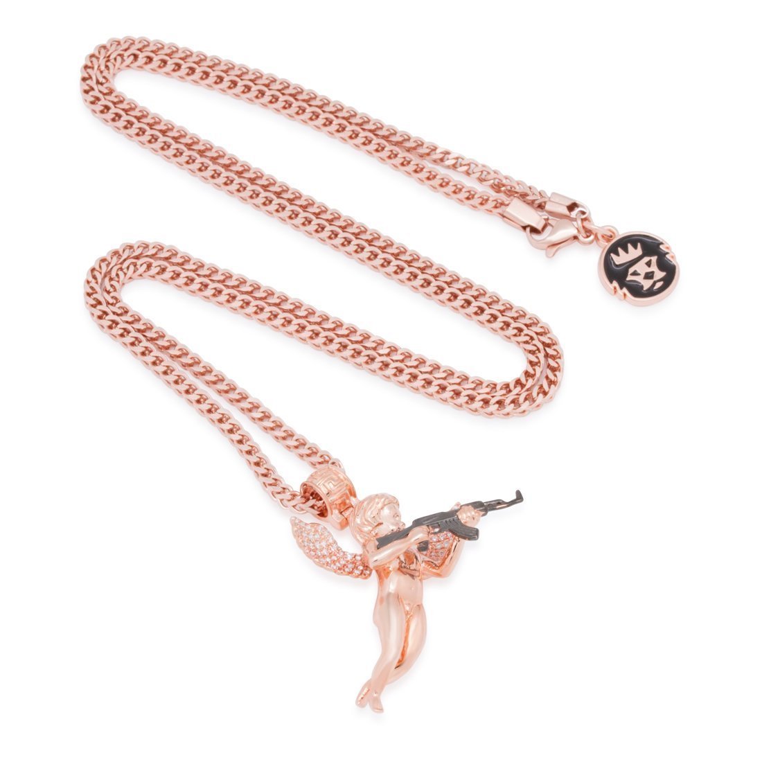 When a debt is owed, The Archangel of Reprisal ensures the debt is paid. Plated in 14K gold, each angel comes studded in clear, CZ stones along with its wings, while its black-plated AK-47 ensures its aim stays true and its punishment swift. Meanwhile, its Greek-key bale provides the perfect option for the 2.5mm, 20" Stainless Steel Franco chain included with each pendant.