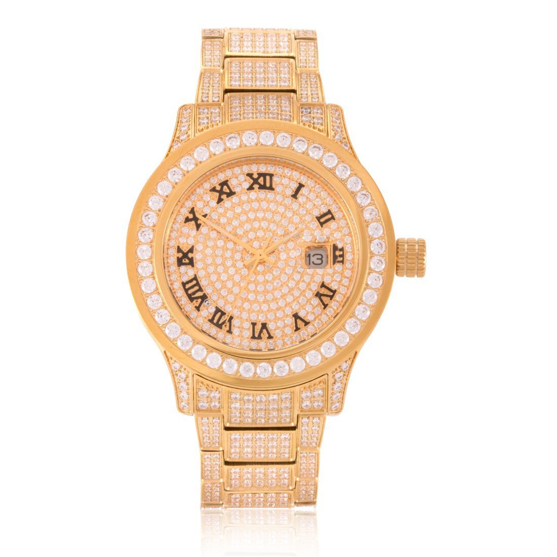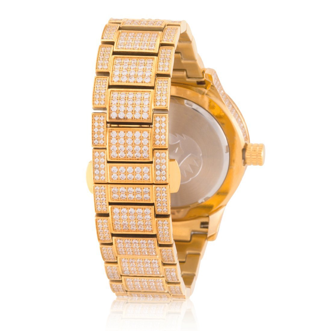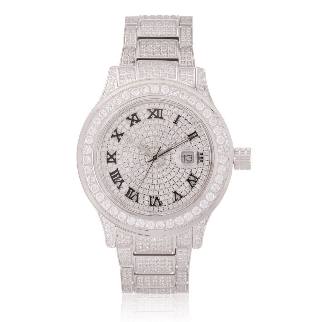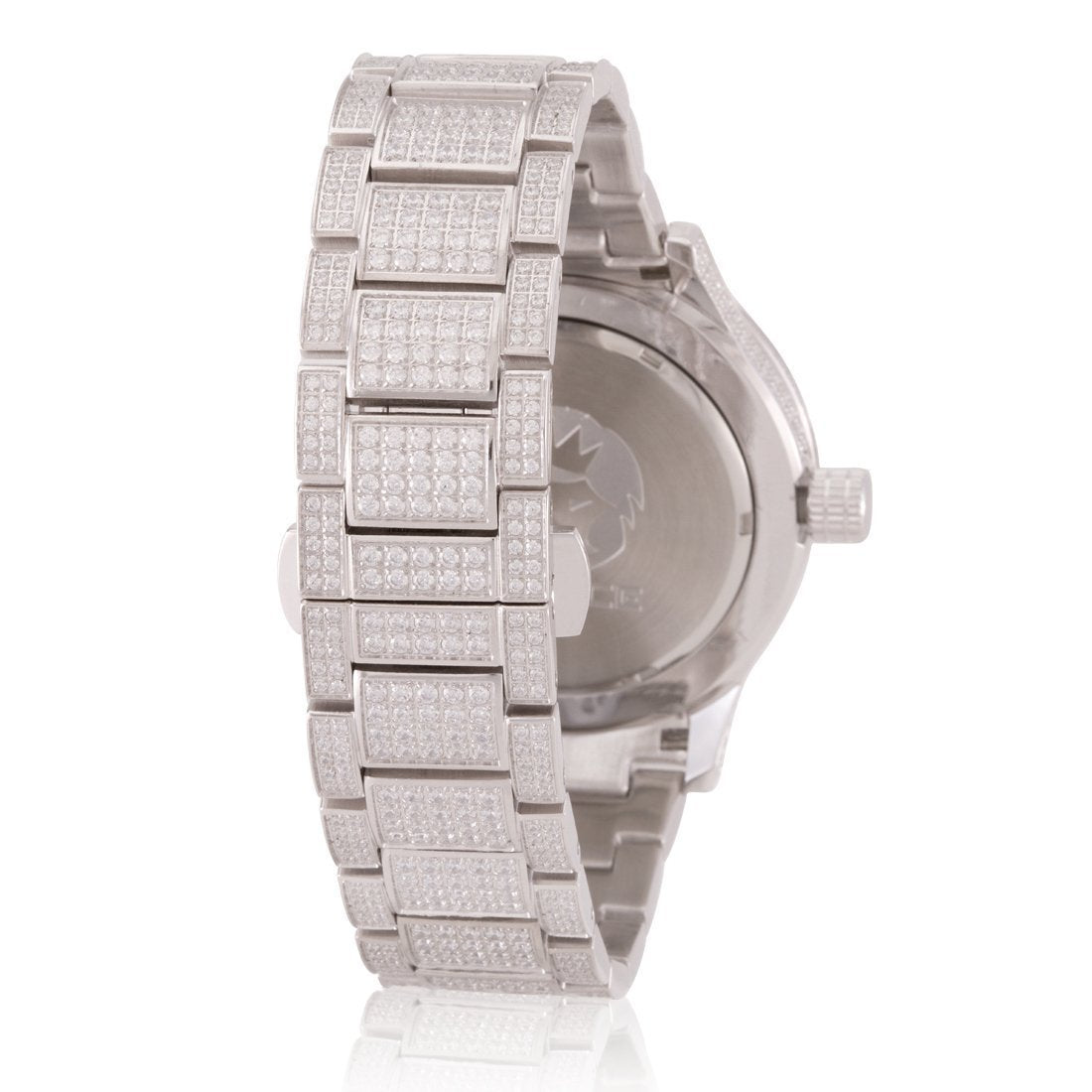 Made from solid stainless steel, The Don Watch provides a vibrant display of character and charisma. Each watch features over 1,000 handset VVS Diamond Simulate stones. Available in 14K gold plating or white gold plating, the Don Watch lets you feel like the king!