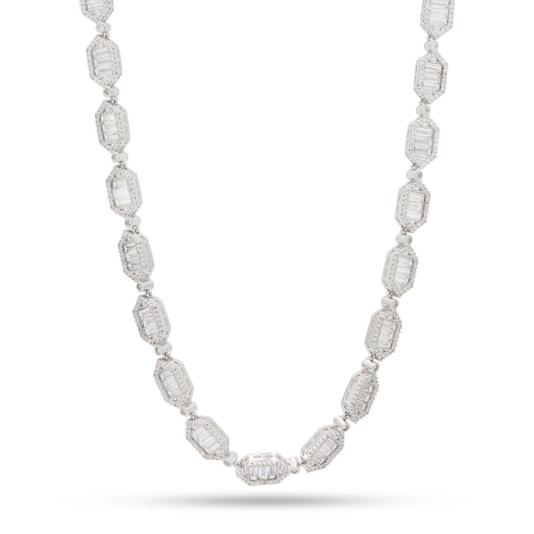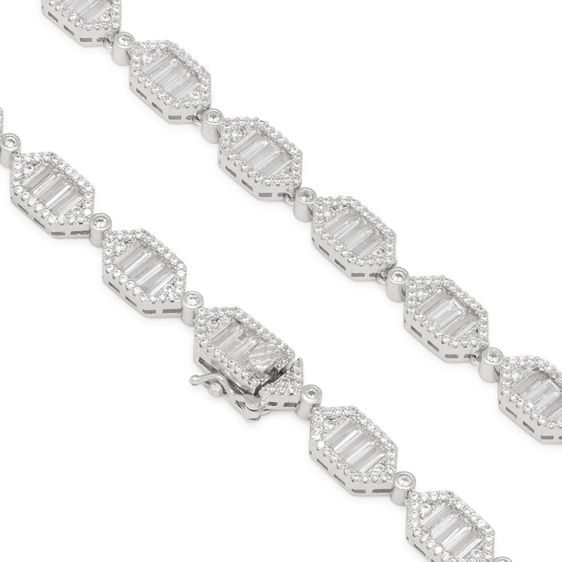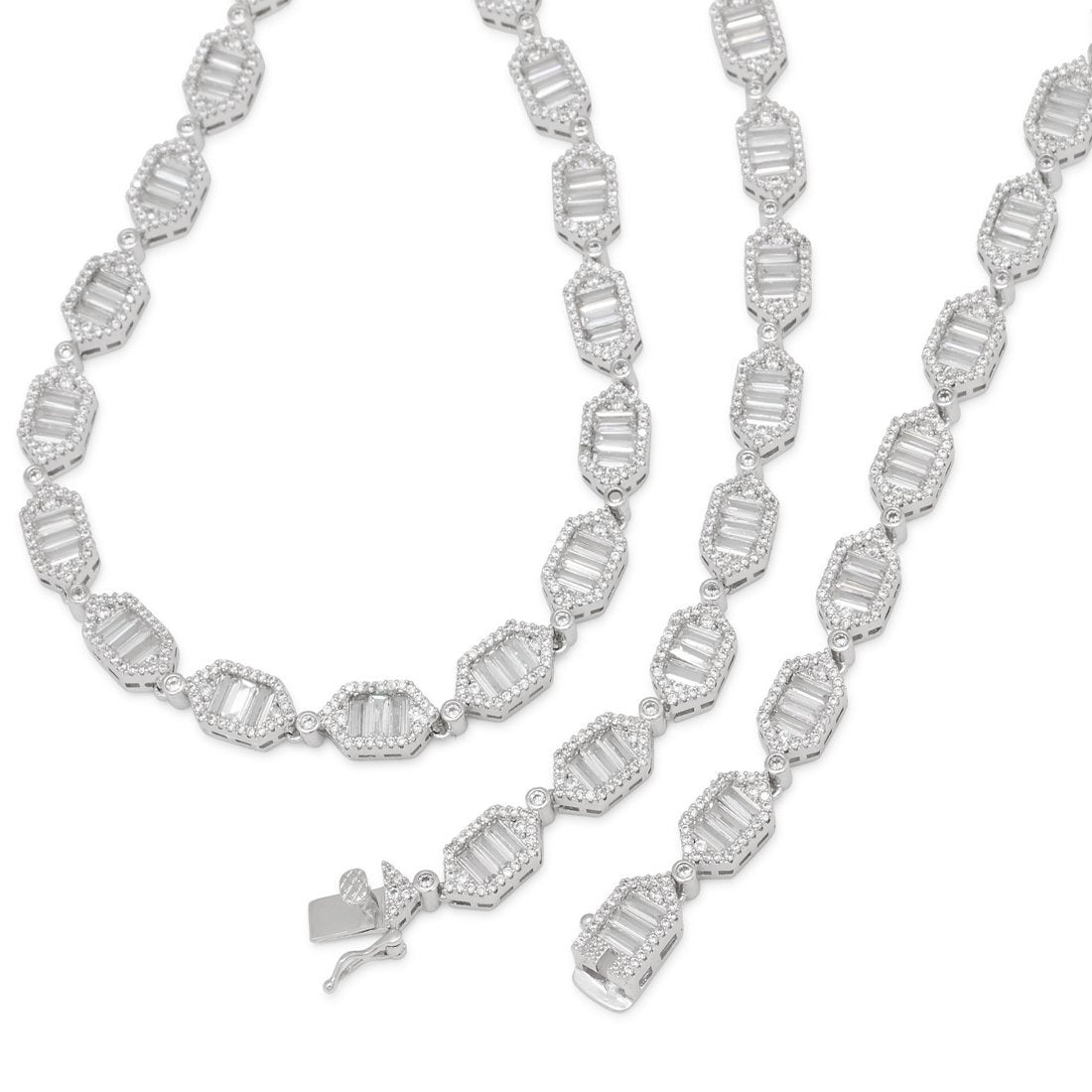 The Hexagon Chain is iced with handset CZ stones. Glistening round cut stones neatly border the emerald cut stones for a bright look. The chain features a hallow bridge under the stones. Each chain has a tongue box clasp for a secure wear. The chains are available in 14K Gold and white gold plating, as well as in different lengths for different styles.