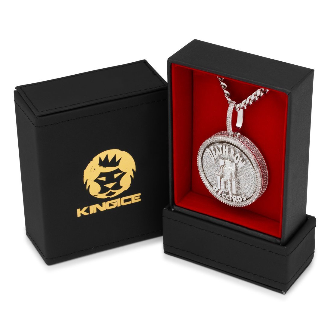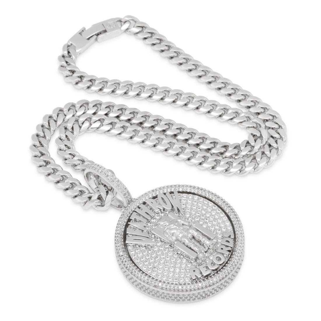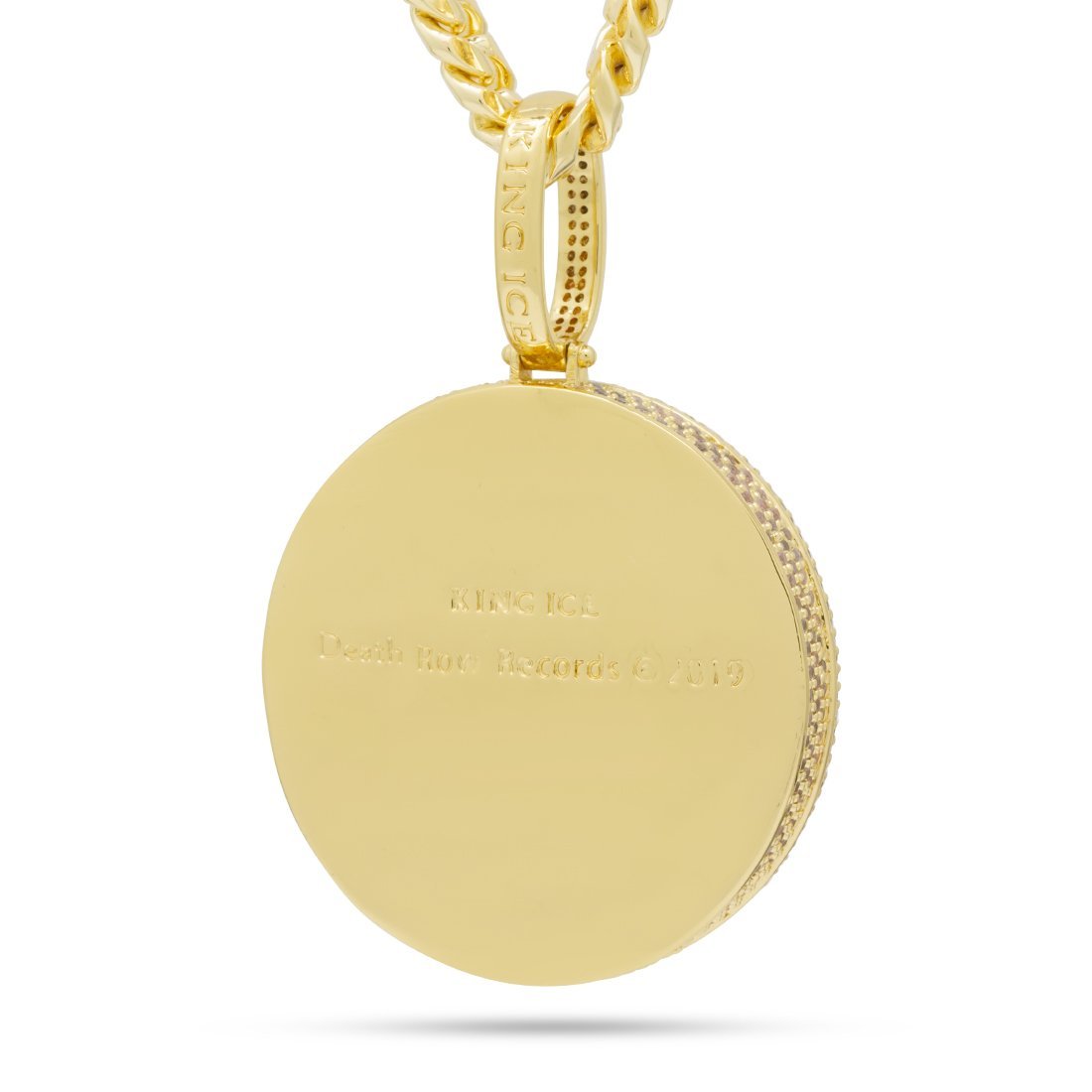 Part of the second official King Ice x Death Row collab drop, King Ice introduces the new Medallion Spinner. Paying tribute to the spinner culture in hip-hop, the medallion features the infamous Death Row Records logo with a full 3-D design on a spinning plate flooded with CZ stones. Available in 14K Gold and white gold plating, the entire pendant is iced with more than 700 handset CZ stones for a bright finish. Each pendant is paired with an 8mm, 20" Miami Cuban chain.