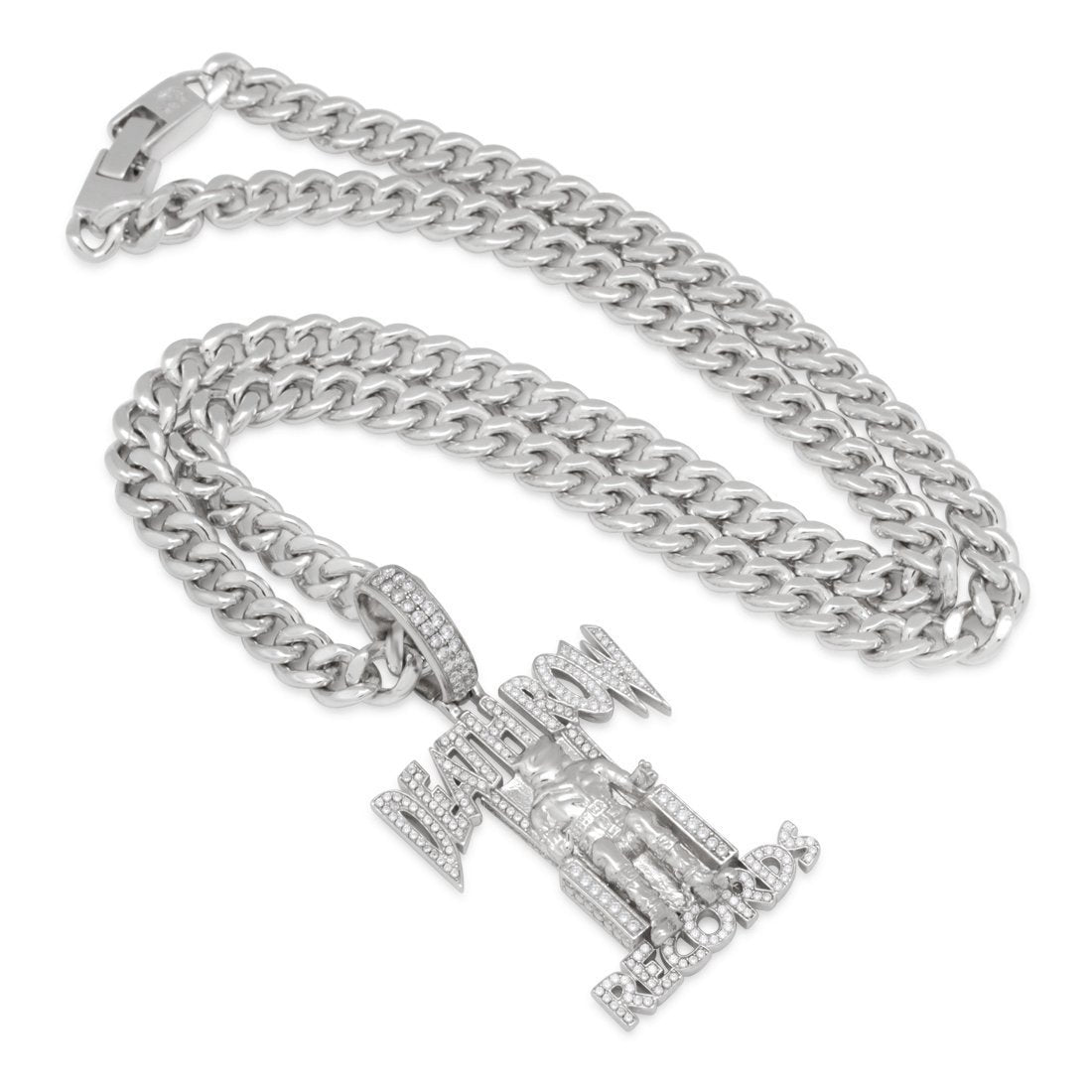 Using solid .925 sterling silver with 14K Gold plating or white gold plating and handset CZ stones, the Death Row necklace perfectly resembles the iconic brand label. Each piece is paired with an 8mm, 24" .925 Sterling Silver Miami Cuban Curb chain.