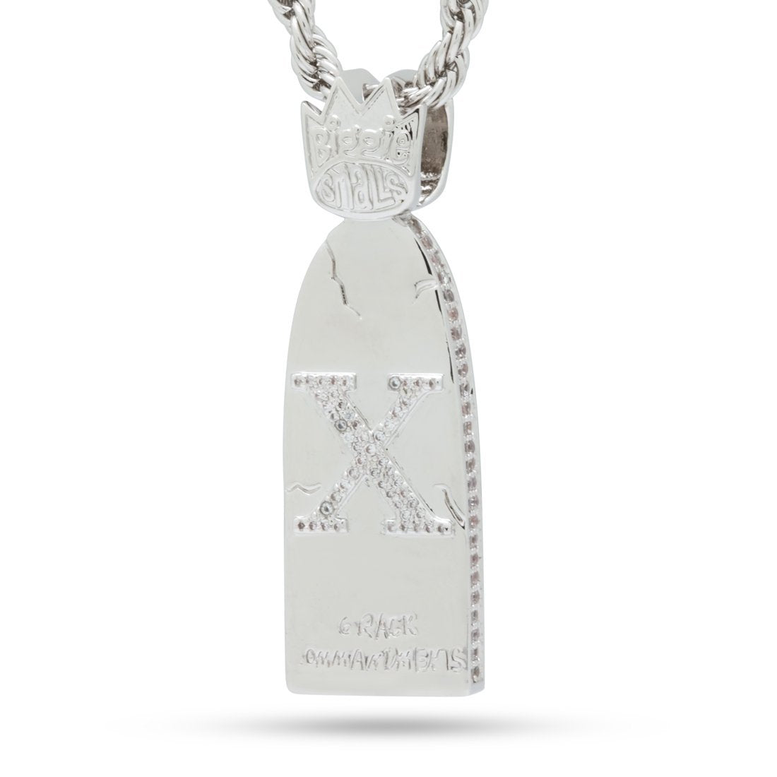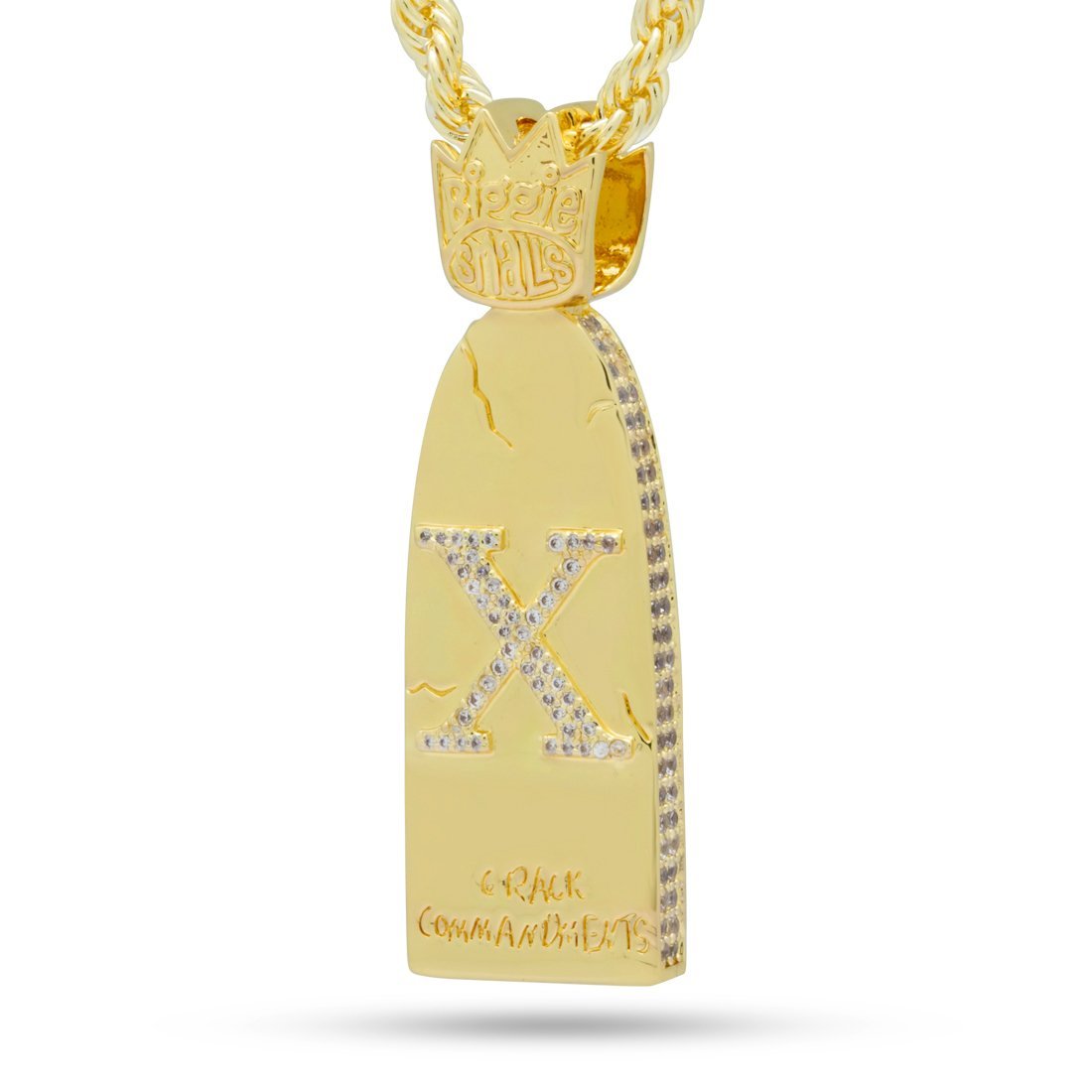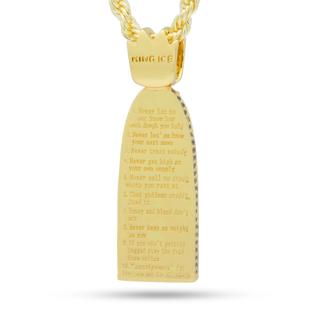 Based off the hit single from Notorious B.I.G., the Ten Crack Commandments necklace features all 10 commandments thou shall follow to get your game on track. CZ stones cover the X and the border of the tombstone for an iced look. Each piece is plated with 14K Gold or white gold and is paired with a 4mm, 24" Rope Chain.