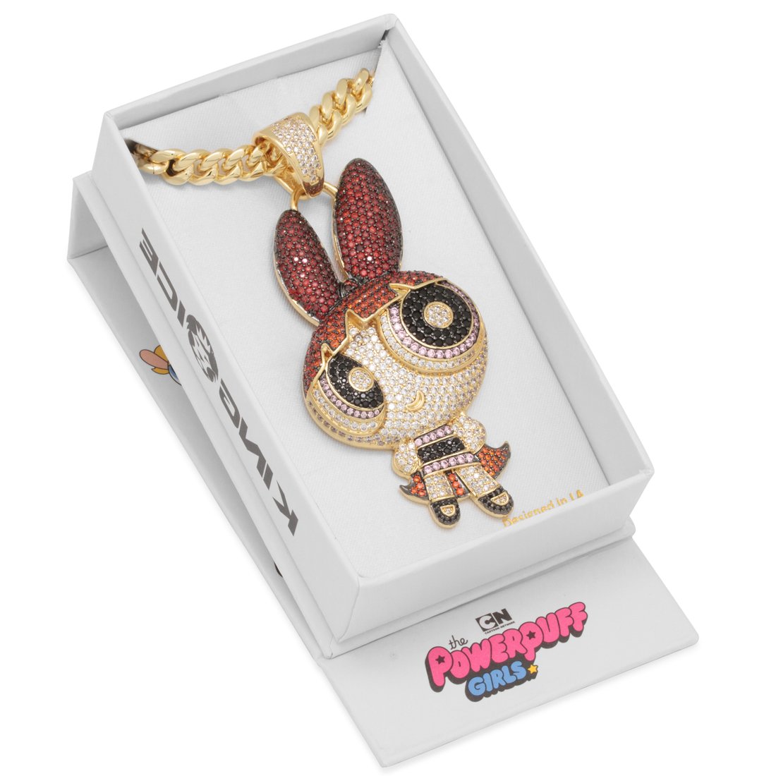 King Ice proudly introduces our favorite superheros, The Powerpuff Girls, filled with sugar, spice, and everything nice. Blossoms confident leadership is obvious with her fiery red hair and classic pink accessories. Each pendant is paired with an 18", 8mm Miami Cuban Chain, available in both gold or white gold boasting over 300 stones on each piece.