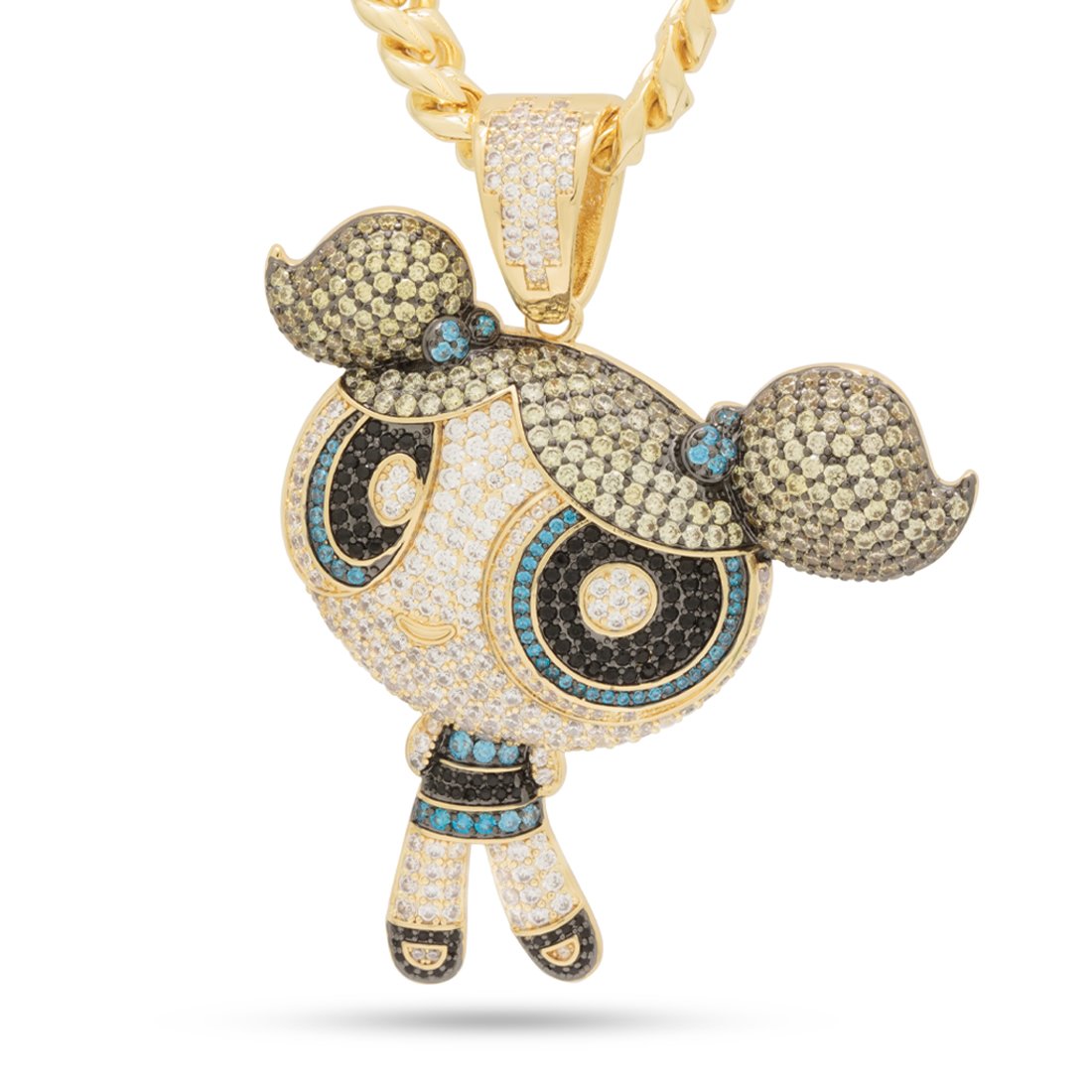 King Ice proudly introduces our favorite superheros, The Powerpuff Girls, filled with sugar, spice, and everything nice. Bubbles sweet, sensitive nature is shown with her blonde, bowed pigtails and signature light blue accessories. Each pendant is paired with an 18", 8mm Miami Cuban Chain, available in both gold or white gold boasting over 300 stones on each piece.