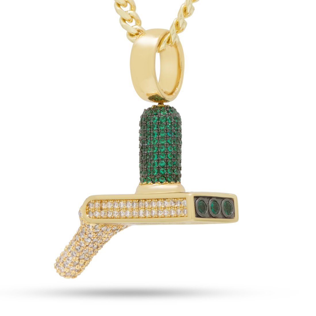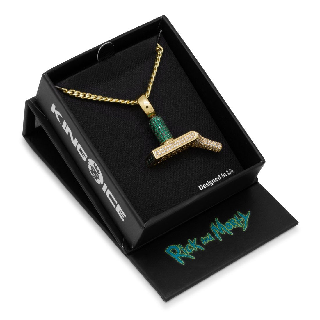 Part of the official Rick and Morty x King Ice collab, the infamous Portal Gun is covered in green and clear VVS Diamond Simulates. The handset stones detail every part of the gun, making it shine with the 14K Gold plating. Each pendant comes with a 3mm 20" Miami Cuban chain.