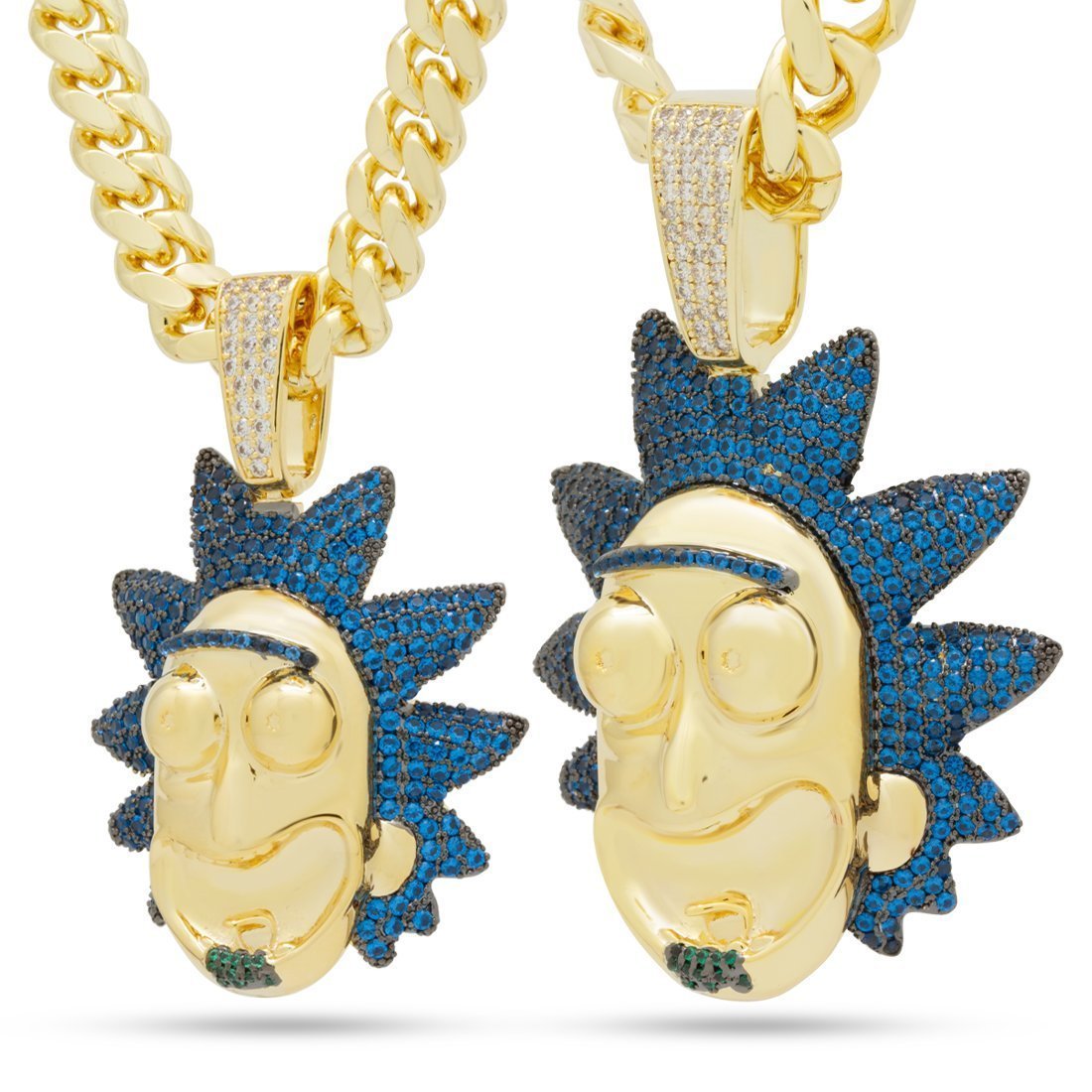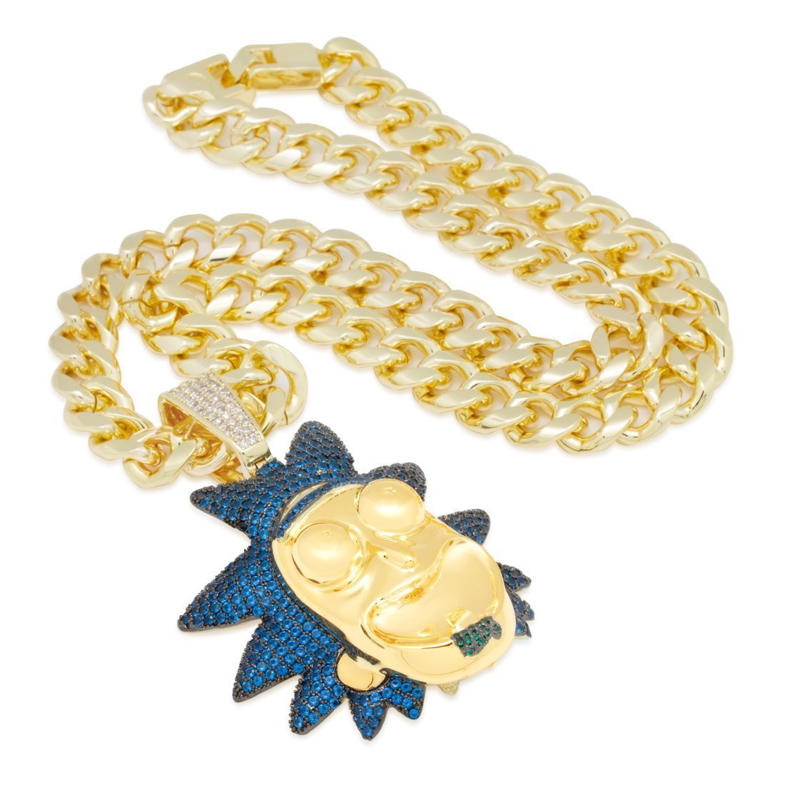 The XL Good Rick pendant showcases the mad scientist in aquamarine VVS Diamond Simulate stones and 14K Gold plating for a vibrant display. The 3D design provides that excitable and crazy grin of Rick that viewers know. The small size pendant is paired with an 8mm, 20" Miami Cuban chain, while the large pendant comes with a 12mm, 24" Miami Cuban chain.