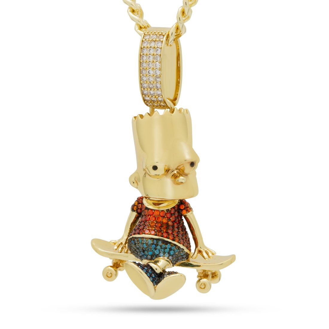 A new addition to the official Simpsons x King Ice collaboration, the Skater Bart Necklace has a 3D Bart Simpson relaxing on his skateboard. His clothing is iced with orange and blue lab created diamond simulates. The large bail is iced with even more stones. Each pendant is paired with a 5mm, 20" Miami Cuban chain. The piece is available in 14K Gold plating and white gold plating.