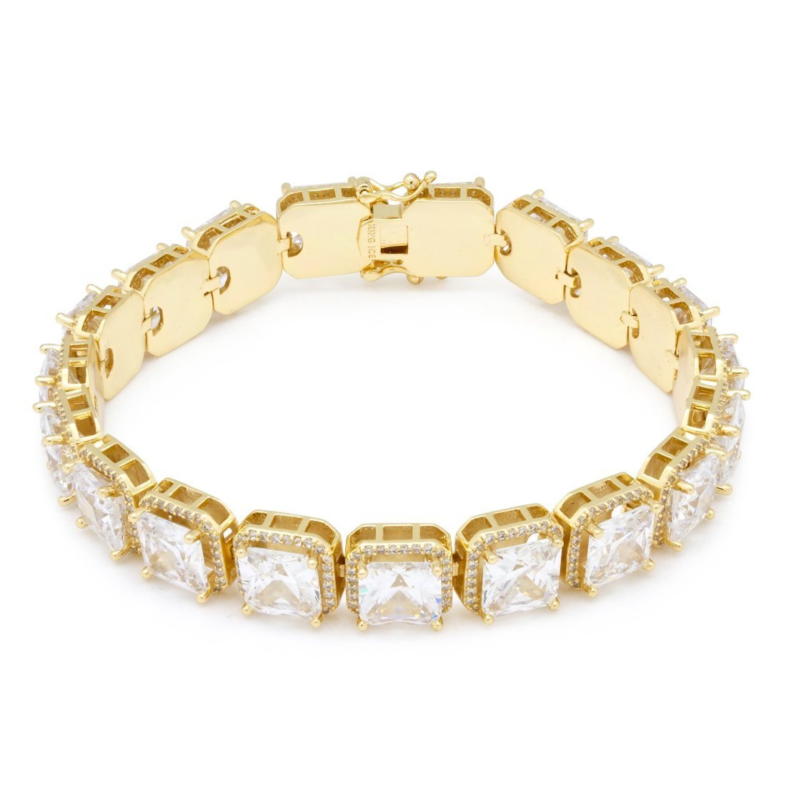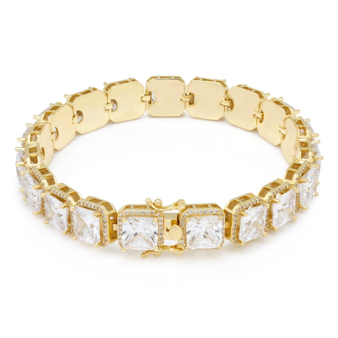 The 14K Gold Princess Cut Tennis Bracelet has a large CZ stone princess cut stone supported by four prongs. Glistening round stones neatly border the emerald stone for extra ice. The 14K Gold plated bracelet features a hallow bridge under the emerald stone, giving each link a detailed look. Each chain has a tongue box clasp for a secure wear.