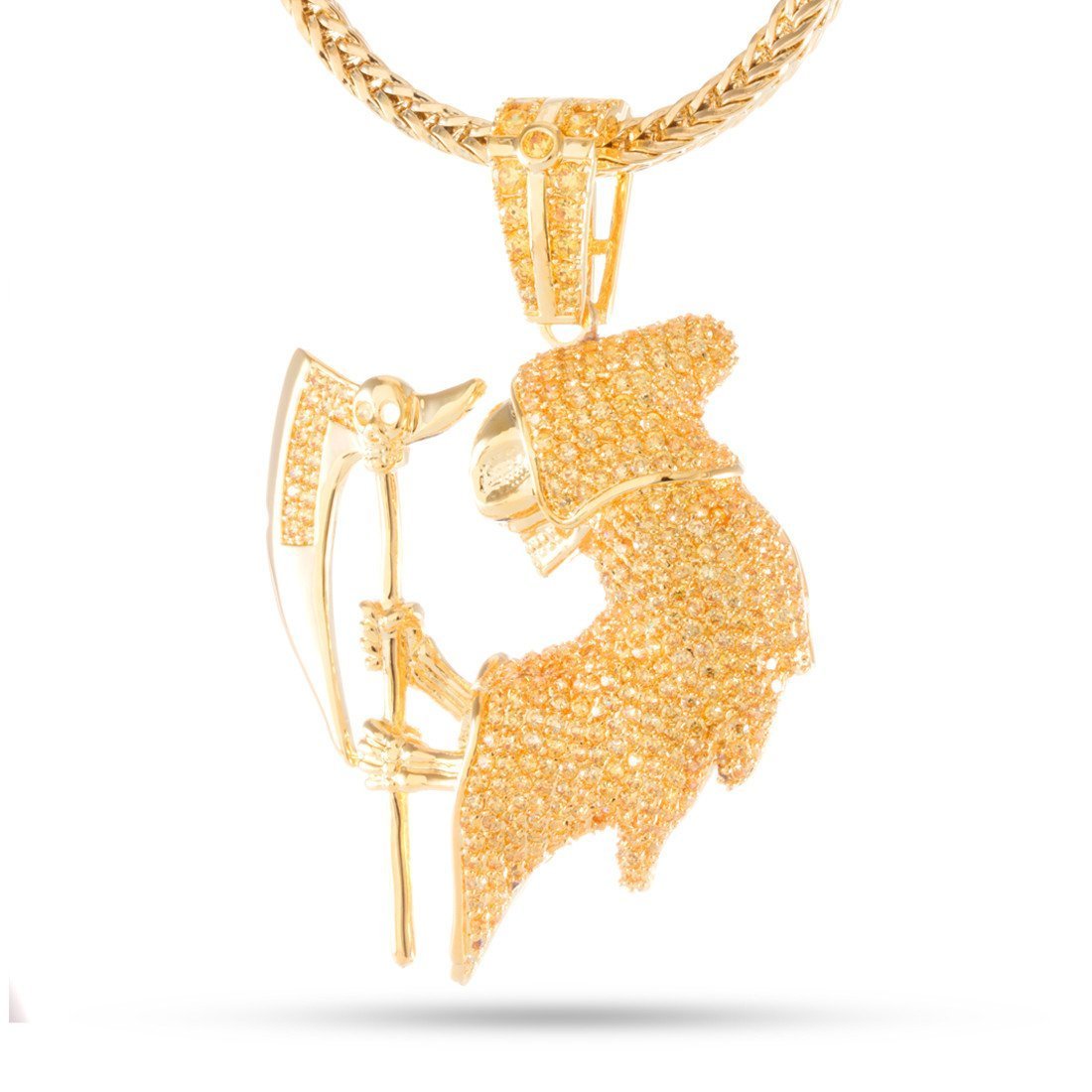 Cop this King Ice exclusive gold plated Grim Reaper pendant! This gold plated brass Grim Reaper pendant is covered with round cut yellow cubic zirconia stones in a micro pave setting. Features a caged back for added support. Available in other colors. Add this to your jewelry collection today. These won't last long. Each includes a 4mm, 26" franco chain.