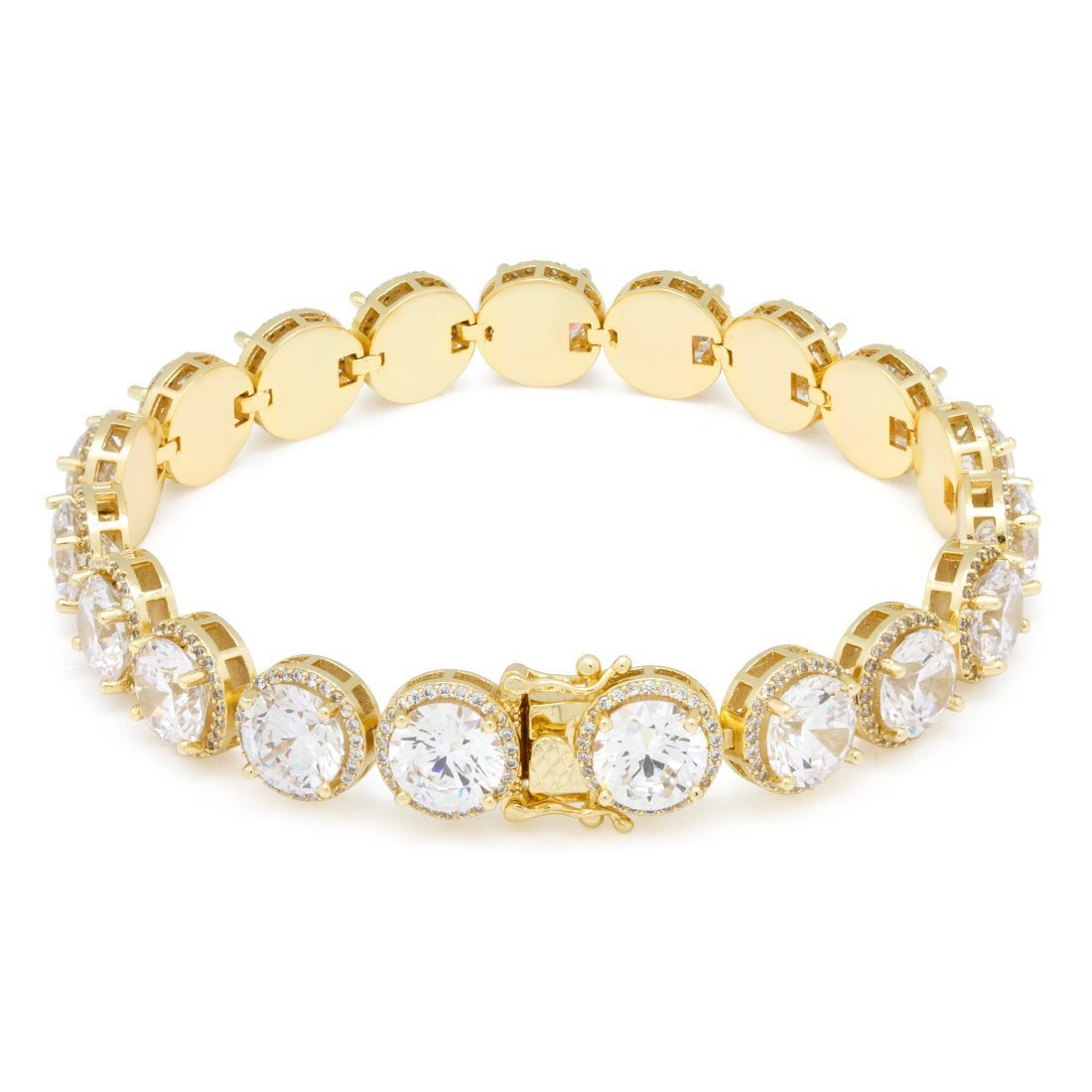The 14K Gold Round Cut Tennis Bracelet has large round cut CZ stones all around. Glistening small stones neatly border the large stone for extra ice. The 14K Gold plated bracelet features a tongue box clasp for a secure wear.