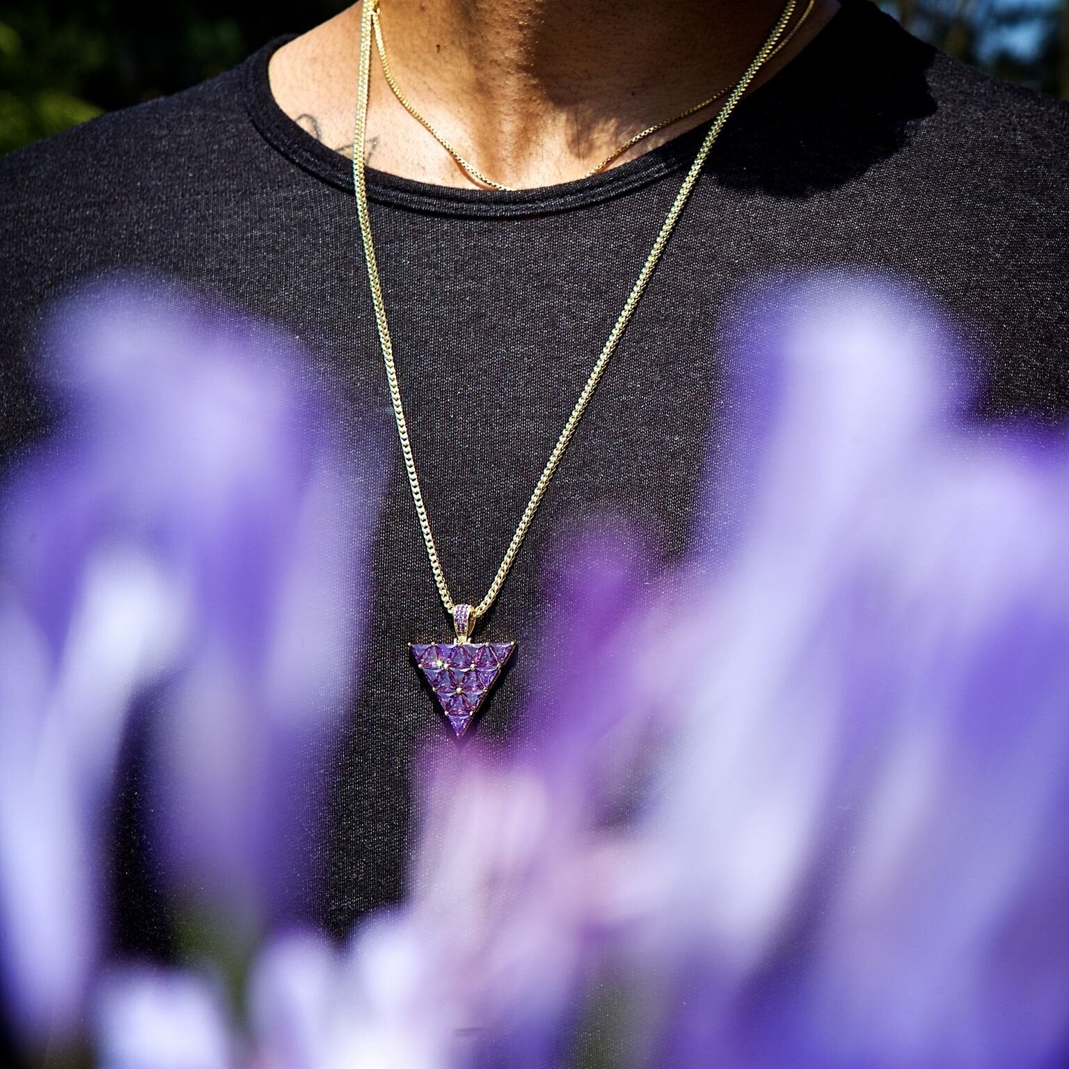 A symbol of geometric perfection, the Trinus takes its inspiration from the All-Seeing Eye, the trinity of Christianity. Each Trinus piece uses AAA, CZ stones to create its aura of light that burst throughout your eyes, while its 2.5mm, 26” chain provides the perfect pairing for this one-of-king King Ice piece.