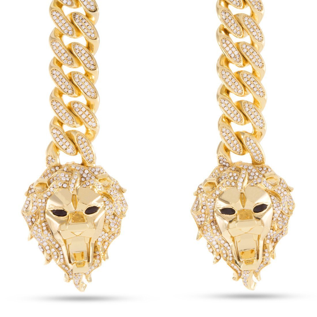 Ditching the traditional clasp comes the Lion Chain set that's set to define the new status of King Ice designs. Each 3D scarf lion design comes studded in CZ stones and plated with 14K Gold for a bright finish. The thick 15mm Cuban Chain is sure to sure stand out next to any chain.
