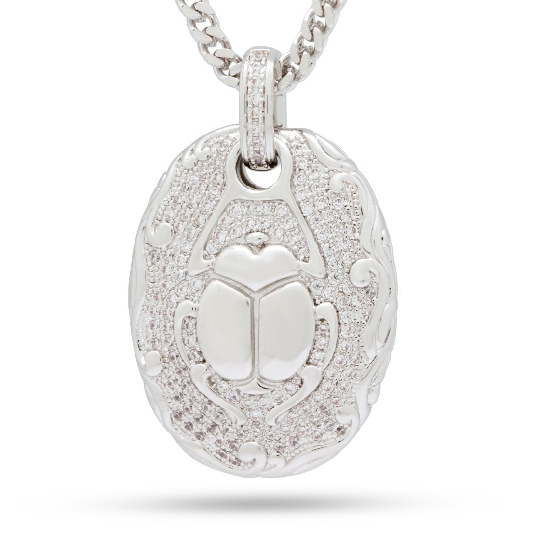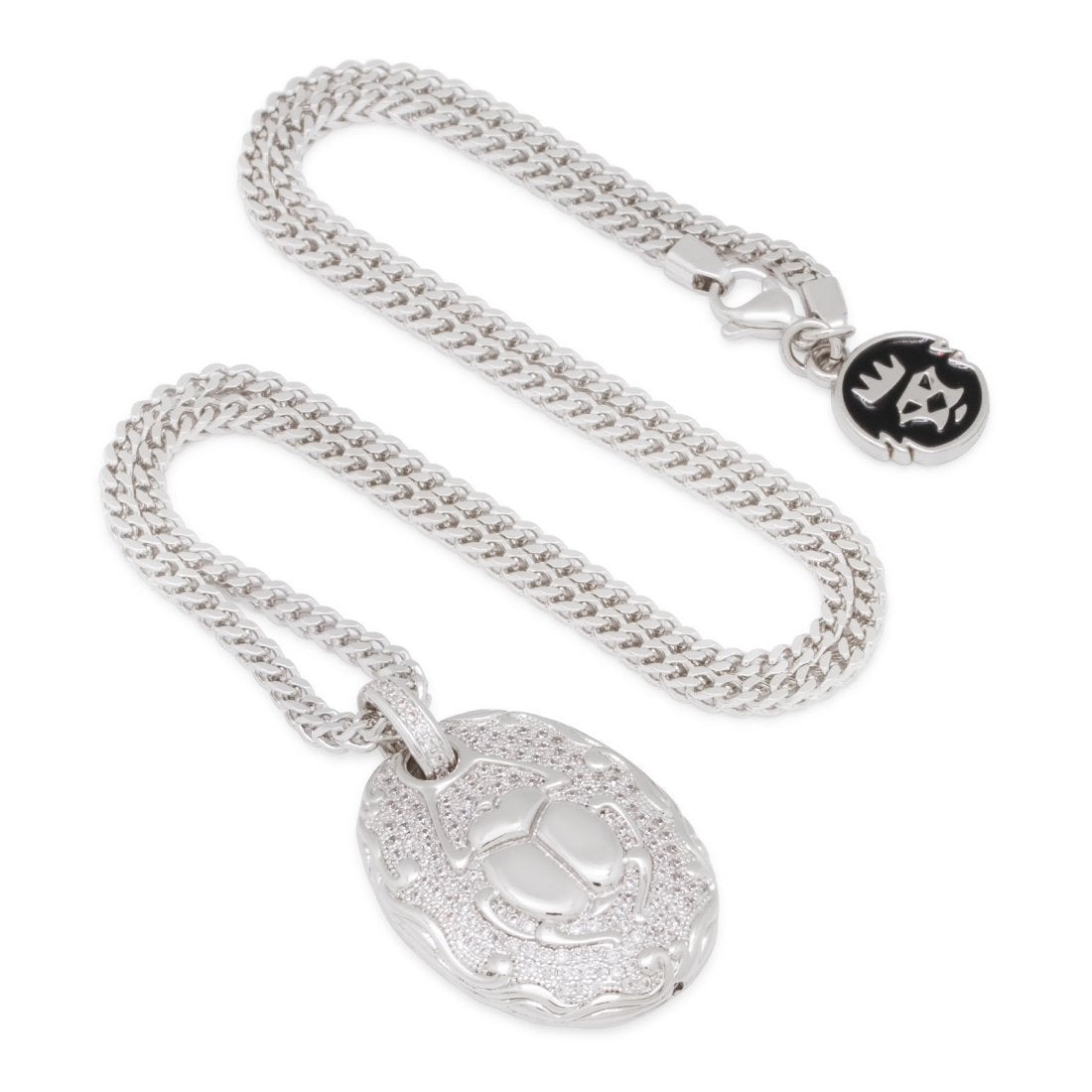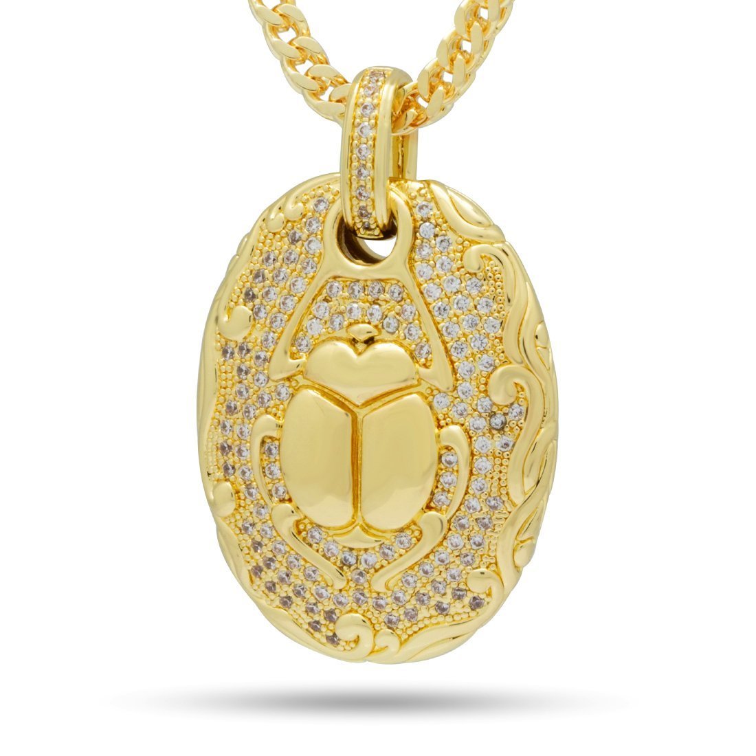 The new scarab beetle necklace pays tribute to the Egyptian Sun God Khepri. Khepri is also a symbol of death and rebirth. Each scarab is encrusted with handset CZ stones to illuminate the beetle's body. Each necklace is plated with 14K Gold and comes with a 2.5mm, 20" Franco Chain.