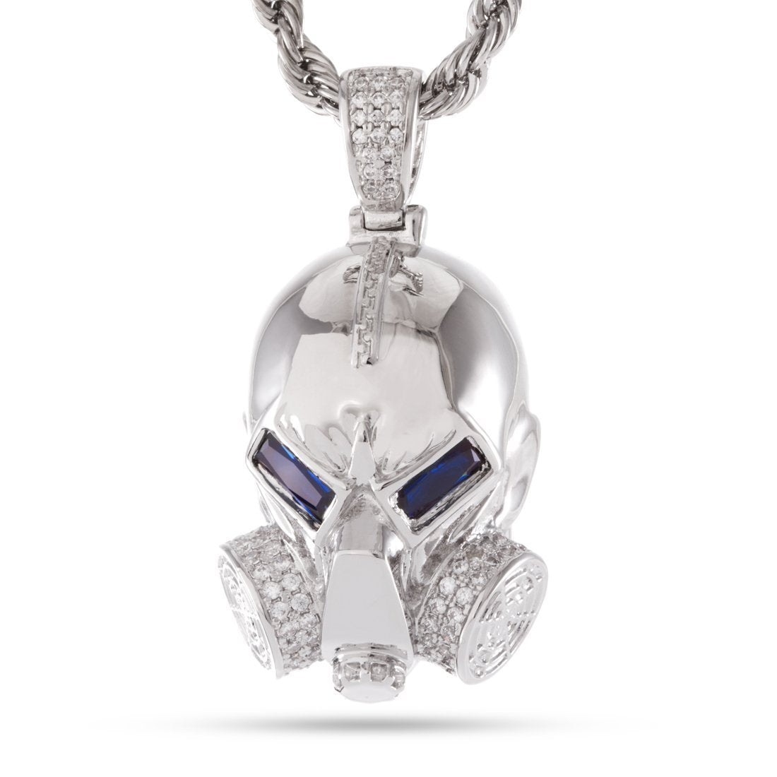 Its evil stare gives off a bone-chilling appearance thanks to its blue-CZ-encrusted eyes, while the iced-out ventilation tubes provide that iconic King Ice appearance. Each piece features a 4mm, 24” Rope chain to complete its look.