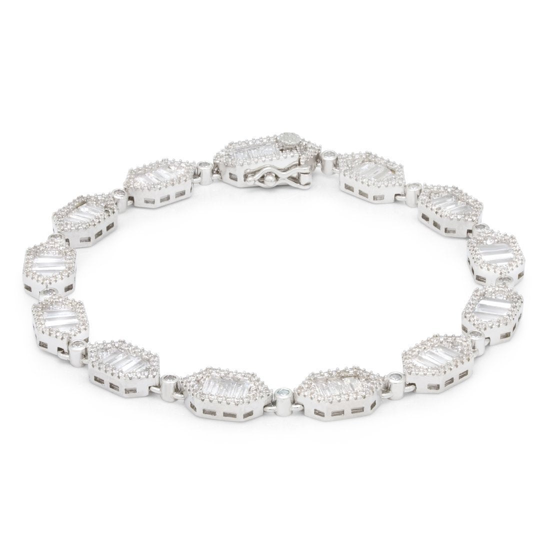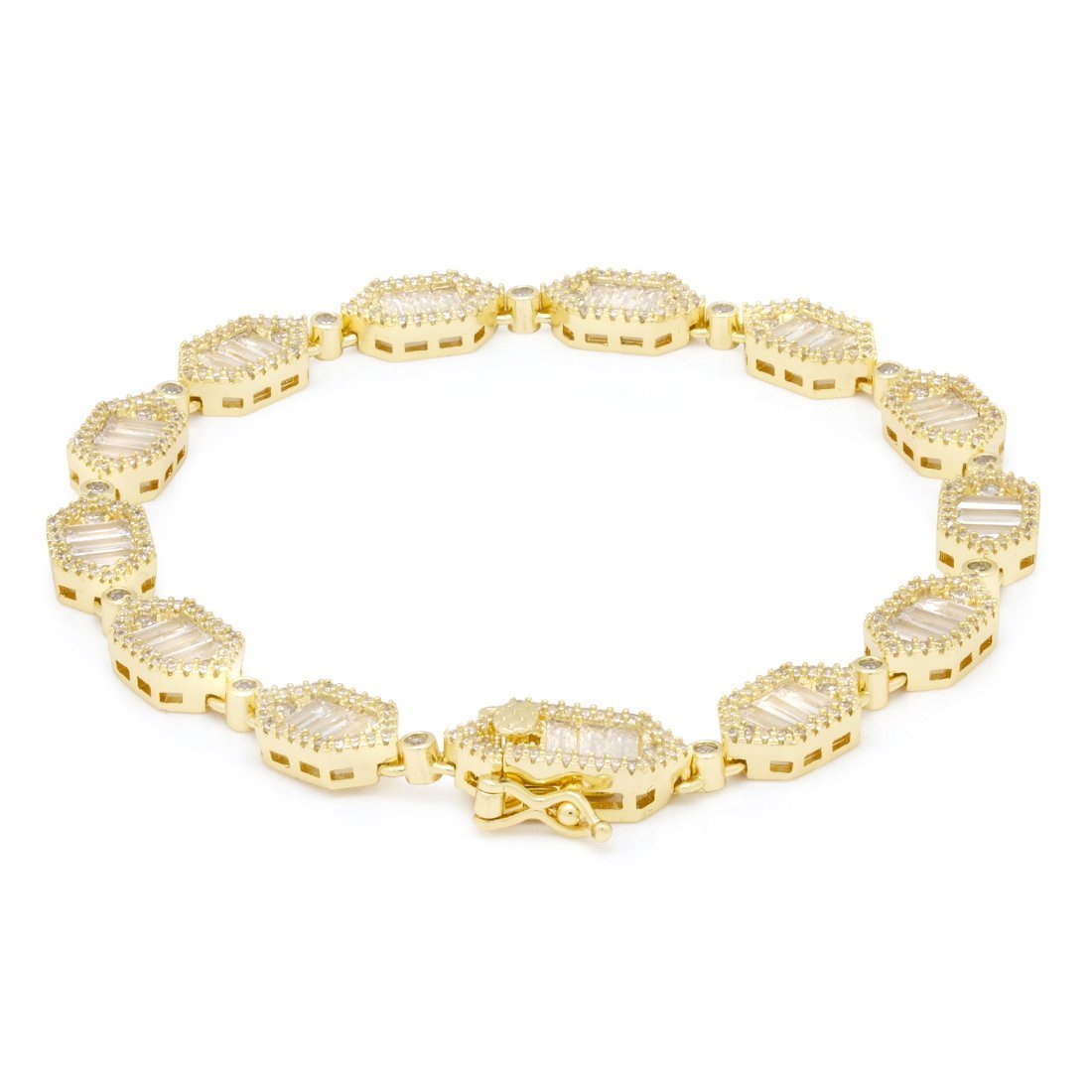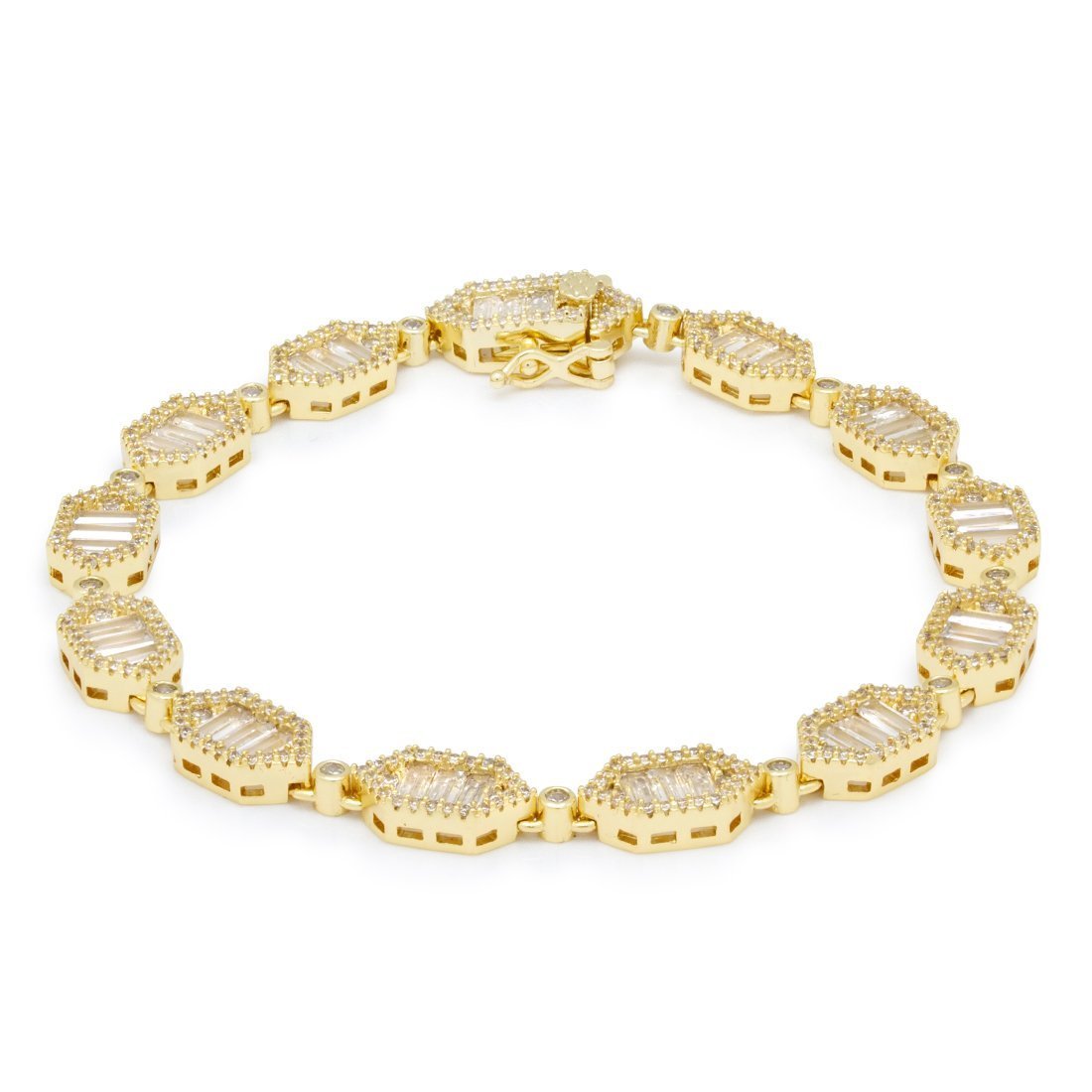 The Hexagon Bracelet is iced with handset CZ stones. Glistening round cut stones neatly border the emerald cut stones for a bright look. The bracelet features a hallow bridge under the stones. Each bracelet has a tongue box clasp for a secure wear. The bracelets are available in 14K Gold and white gold plating and measure 8". They match perfectly with the new Hexagon Chain.