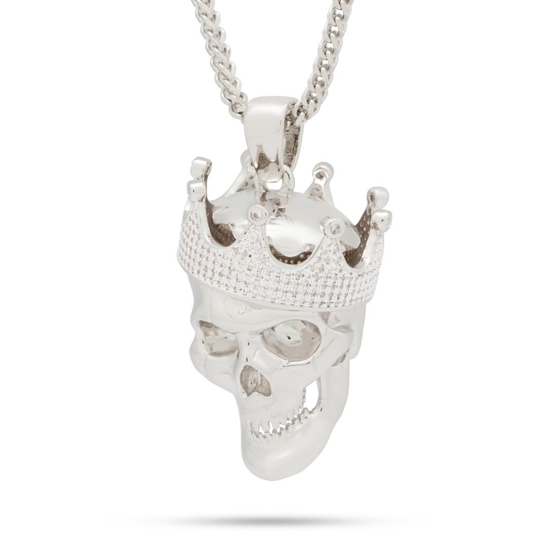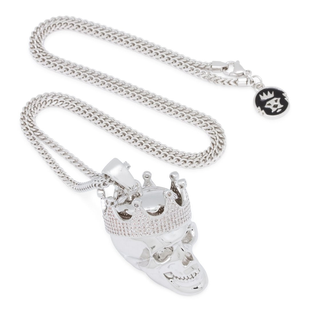 Rocking his tilted crown, the Skull King uses his deathly stare to invoke fear into his enemies. Plated in White gold, this solid piece provides the perfect look for any occasion. Each piece features AAA, handset stones around its crown and includes a 26", 2.5mm stainless steel Franco chain.